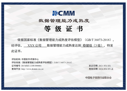 DCMM(数据管理能力成熟度评价模型)评估划分为五个等级,自低向高依次为初始级、受管理级、稳健级、量化管理级和优化级,不同等级代表企业数据管理和应用的成熟度水平不同,证书自颁发之日起有效期3年