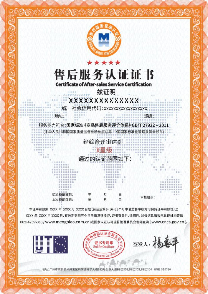 GB/T27922商品售后服务评价体系认证是指对企业的服务体系、商品服务、顾客服务三大方面进行评价。售后服务认证是服务认证,与管理体系认证不是一个类别,它使用的GB/T27922标准是一个评价性质的标准,关键词是“评价体系”,认证目的是评出优秀。认证的结果是证明企业按照标准实施了服务,并达到了某一个高度(星级)。