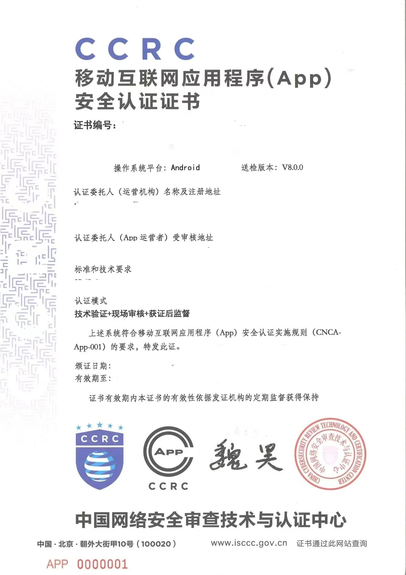APP认证全称叫移动互联网应用程序(App)安全认证,针对具有收集、存储、传输和使用个人信息行为的APP进行的数据安全认证,是中央网信办、工业和信息化部、公安部、市场监管总局,为保障个人信息安全,维护广大网民合法权益而推出的安全认证,并鼓励App运营者自愿通过App安全认证。